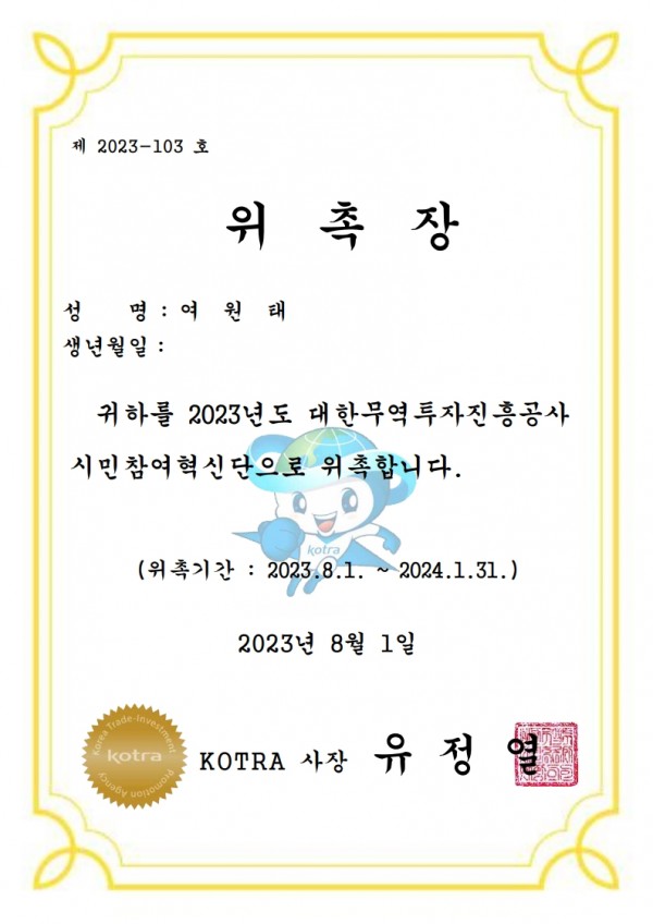 Letter of Appointment of KOTRA Citizen Participation Innovation Group 관련링크 mondereve 407 0 본문 Letter of Appointment of KOTRA Citizen Participation Innovation Group SHARE THIS PAGE 목록